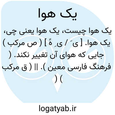 یک هوا. [ ی َ / ی ِ هََ ] ( ص مرکب ) جایی که هوای آن تغییر نکند. ( فرهنگ فارسی معین ). || ( ق مرکب ) ( اصطلاح عامیانه ) اندکی. کمی. مقدار اندک: کفش اگر یک هوا بزرگتر باشد مناسب تر است.
