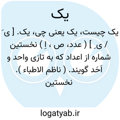 یک. [ ی َ / ی ِ ] ( عدد، ص، اِ ) نخستین شماره از اعداد که به تازی واحد و اَحَد گویند. ( ناظم الاطباء ). نخستین شماره عددی که در مرتبه اول واقع است. ( حاشیه برهان چ معین ). احد. ( ناظم الاطباء ) ( آنندراج ) ( حاشیه برهان چ معین ). واحد. ( ناظم الاطباء ). احد. وحد. واحد. ( یادداشت مؤلف ). نماینده آن در ارقام هندیه «ا» است و در حساب جُمَّل، صورت الف. امروز در تلفظ غالباً به کسر یاء آورند ولی به فتح درست است، چنانکه حافظ در غزلی آن را با «نمک » و«محک » و «فلک » و غیره قافیه آورده است: