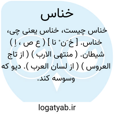 خناس. [ خ َن ْ نا ] ( ع ص، اِ ) شیطان. ( منتهی الارب ) ( از تاج العروس ) ( از لسان العرب ). دیو که وسوسه کند. ( مهذب الاسماء ). عزازیل. ابلیس. ابوخلاف. ( یادداشت بخط مؤلف ): الخناس، الذی یوسوس فی صدور الناس. ( قرآن 114 / 5 و 4 ).