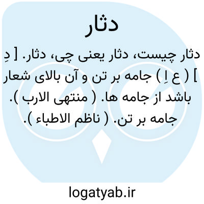 دثار. [ دِ ] ( ع اِ ) جامه بر تن و آن بالای شعار باشد از جامه ها. ( منتهی الارب ). جامه بر تن. ( ناظم الاطباء ). جامه که بتن ملصق نباشد مانند چادر و جبه و عبا و آن بر روی شعار قرار گیرد از جامه ها. ( از ناظم الاطباء ). مقابل شعار. جامه که بر بالای جامه دیگر پوشند و آن جامه زیرین را شعار گویند. ( آنندراج ). جامه بیرونی. آنچه بر زبرپوشند. جامه که بر بالای جامه پوشند. جامه بر تن فوق شعار. جامه زبرپوش. روپوش. زبرپوش. جامه روی. مقابل جامه زیرین. هر جامه که به بدن ملصق نباشد و آنرا بر جامه دیگر پوشند مثل چادر و رضائی. ( غیاث ). جامه روی پوش. ج، دُثُر. ( مهذب الاسماء ):