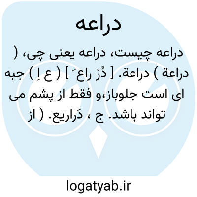 ( دراعة ) دراعة. [ دُرْ راع َ ] ( ع اِ ) جبه ای است جلوباز،و فقط از پشم می تواند باشد. ج، دَراریع. ( از اقرب الموارد ). جامه ای است و اکثر جامه صوف را گویند. ( آنندراج ): و من دخل الدار علی مراتب فمنهم من یلبس المبطنة و منهم من یلبس الدراعة و منهم من یلبس القباء.( البیان و التبیین ج 3 ص 78 ). و رجوع به دراعه شود.