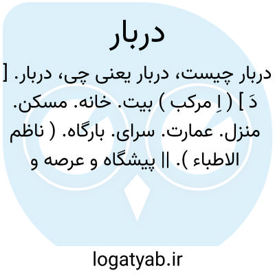 دربار. [ دَ ] ( اِ مرکب ) بیت. خانه. مسکن. منزل. عمارت. سرای. بارگاه. ( ناظم الاطباء ). || پیشگاه و عرصه و بارگاه پادشاهان و امرا. ( ناظم الاطباء ). و به عربی حضرةالسلطان و حضرةالامیر گویند. ( آنندراج ). کاخ شاهی. قصر سلطنتی. بارگاه:
