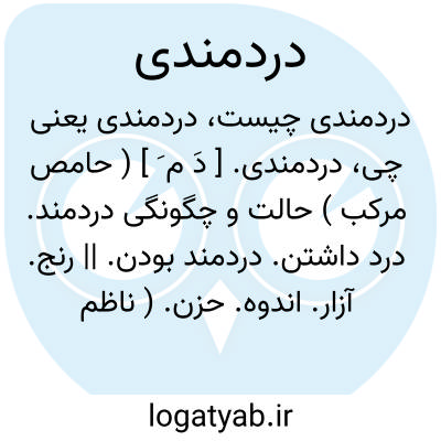 دردمندی. [ دَ م َ ] ( حامص مرکب ) حالت و چگونگی دردمند. درد داشتن. دردمند بودن. || رنج. آزار. اندوه. حزن. ( ناظم الاطباء ):
