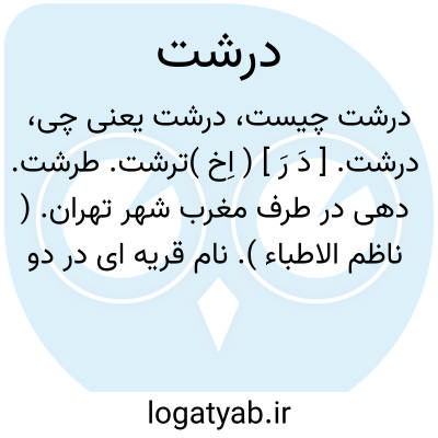 درشت. [ دَ رَ ] ( اِخ )ترشت. طرشت. دهی در طرف مغرب شهر تهران. ( ناظم الاطباء ). نام قریه ای در دو فرسنگی طهران از سوی مغرب و درنسبت بدان درویستی گویند. قریه ای است به شمال غربی طهران در دو فرسنگی و آنرا در قدیم درویست می گفتند وعلما و فقهای بسیاری از این قریه ظهور کرده اند. ( یادداشت مرحوم دهخدا ). امروز جزء محلات تهران است و از وضع قدیم آن جز نامی باقی نیست. رجوع به طرشت شود.