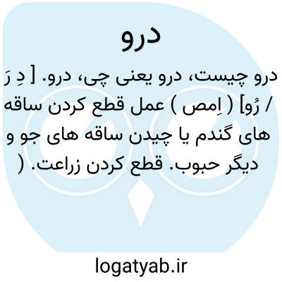 درو. [ دِ رَ / رُو] ( اِمص ) عمل قطع کردن ساقه های گندم یا چیدن ساقه های جو و دیگر حبوب. قطع کردن زراعت. ( غیاث ). حصاد و چیدن غله و بریدن علف و غله رسیده و یا نیم رس با داس. ( ناظم الاطباء ). درودن. این کلمه با شدن و کردن صرف شود. حصد. صرام. دارا. ( یادداشت مرحوم دهخدا ): استجزاز؛ به درو رسیدن گندم ( از منتهی الارب )؛ به درو آمدن کشت. ( المصادر زوزنی ).