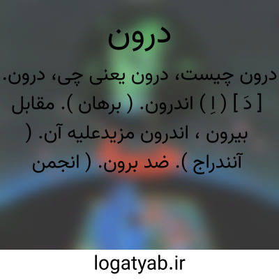 درون. [ دَ ] ( اِ ) اندرون. ( برهان ). مقابل بیرون، اندرون مزیدعلیه آن. ( آنندراج ). ضد برون. ( انجمن آرا ). در میان. ( غیاث ). تو. توی. جوف. باطن. بطن. داخل. شکم. در شکم. دل. در دل. میان. میانه. مقابل ظاهر و بیرون. ( یادداشت مرحوم دهخدا ). در داخل. ( ناظم الاطباء ). جرجب. جوف: