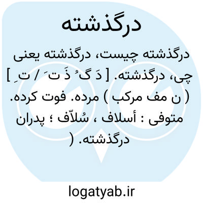 درگذشته. [ دَ گ ُ ذَ ت َ / ت ِ ] ( ن مف مرکب ) مرده. فوت کرده. متوفی: أسلاف، سُلاّف؛ پدران درگذشته. ( منتهی الارب ). پادشاه یا شاه ماضی. پادشاه درگذشته. || تجاوز کرده. عبور کرده.