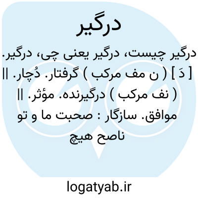 درگیر. [ دَ ] ( ن مف مرکب ) گرفتار. دُچار. || ( نف مرکب ) درگیرنده. مؤثر. || موافق. سازگار: