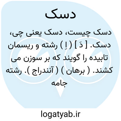 دسک. [ دَ ] ( اِ ) رشته و ریسمان تابیده را گویند که بر سوزن می کشند. ( برهان ) ( آنندراج ). رشته جامه دوختن. ( شرفنامه منیری ). دسه. دشک. و رجوع به دسه و دشک شود.