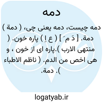 ( دمة ) دمة. [ دَ م َ ] ( ع اِ ) پاره خون. ( منتهی الارب ).پاره ای از خون، و هی اخص من الدم. ( ناظم الاطباء ).