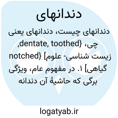 {dentate, toothed, notched} [زیست شناسی- علوم گیاهی] 1. در مفهوم عام، ویژگی برگی که حاشیۀ آن دندانه دندانه باشد 2. در مفهوم خاص، ویژگی برگی که حاشیۀ آن دندانه های تیز و بیرون زده داشته باشد