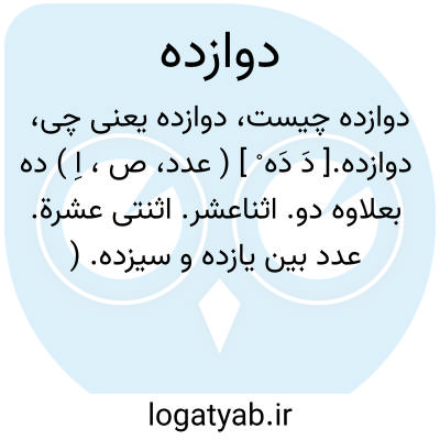 دوازده.[ دَ دَه ْ ] ( عدد، ص، اِ ) ده بعلاوه دو. اثناعشر. اثنتی عشرة. عدد بین یازده و سیزده. ( یادداشت مؤلف ). ترجمه اثناعشر که عدد معروف است. ( آنندراج ). اثنتاعشرة. ( ترجمان القرآن ).