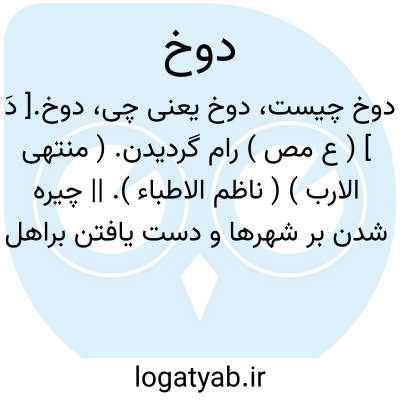 دوخ.[ دَ ] ( ع مص ) رام گردیدن. ( منتهی الارب ) ( ناظم الاطباء ). || چیره شدن بر شهرها و دست یافتن براهل آن. ( منتهی الارب ) ( ناظم الاطباء ) ( آنندراج ). در شهرها گردیدن. ( المصادر زوزنی ). || خوار شدن. ( آنندراج ) ( دهار ) ( تاج المصادر بیهقی ) ( المصادر زوزنی ). || خوار کردن. ( المصادر زوزنی ).