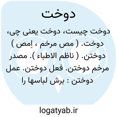 || ( اِ ) بخیه. ( ناظم الاطباء ). || دختر و دوشیزه و باکره. ( منتهی الارب ). دخت. در اصطلاح قدما دختر. دوشیزه. ( فرهنگ فارسی معین ).