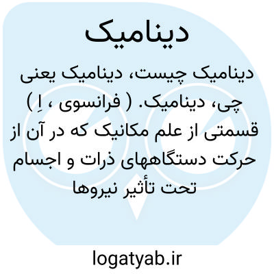 ۱ - ( صفت ) مربوط به قوه: واحد دینامیک. ۲ - پر از نیرو مملو از نیروی حیاتی. ۳ - ( اسم ) بخشی از مکانیک که روابط بین قوی و حرکات را مورد مطالعه قرار میدهد مبحث حرکت اجسام علم الحرکات.