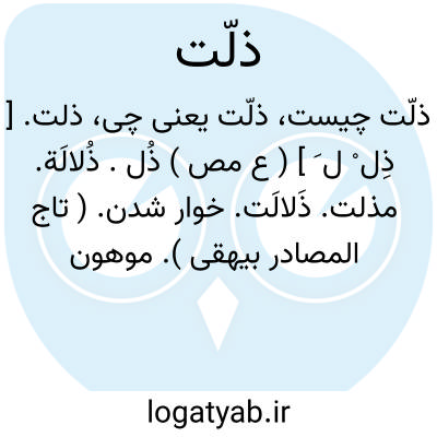 ذلت. [ ذِل ْ ل َ ] ( ع مص ) ذُل. ذُلالَة. مذلت. ذَلالَت. خوار شدن. ( تاج المصادر بیهقی ). موهون گردیدن. خواری. ( نطنزی ). هوان. حقارت. مهانت. زبونی. مقابل، عزّت. ارج، ارجمندی: تعزّ من تشاء و تذل من تشاء. ( قرآن 26/2 ).