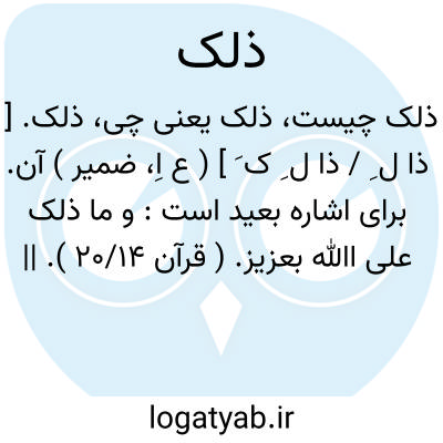 ذلک. [ ذا ل ِ / ذا ل ِ ک َ ] ( ع اِ، ضمیر ) آن. برای اشاره بعید است: و ما ذلک علی اﷲ بعزیز. ( قرآن 20/14 ). || این است: ذلک فضل اﷲ یؤتیه من یشاء. ( قرآن 54/5 و 21/57 و 4/62 ).