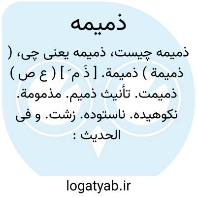 ( ذمیمة ) ذمیمة. [ ذَ م َ ] ( ع ص ) ذمیمت. تأنیث ذمیم. مذمومة. نکوهیده. ناستوده. زشت. و فی الحدیث: الشوم و الطیرة ذروها ذمیمة؛ ای مذمومة. || بئر ذمیمة؛ چاه کم آب. چاه پرآب. چاه بسیارآب. ( از اضداد است ). || ( اِمص ) بر جای ماندگی. زمامت. ج، ذمیمات، ذمایم.