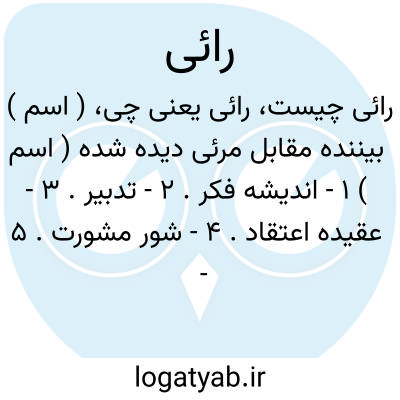 ( اسم ) ۱ - اندیشه فکر. ۲ - تدبیر. ۳ - عقیده اعتقاد. ۴ - شور مشورت. ۵ - قصد عزم. ۶ - جولان خاطر است در مقدماتی که امید میرود که منتج به نتیجه گردد. ۷ - نظر حاکم درباره مدعی و مدعی علیه حکم. ۸ - نظر قاضی در تفسیر قانون. یا اصحاب قیاس اصحاب قیاس پیروان ابو حنیفه جمع آرائ.