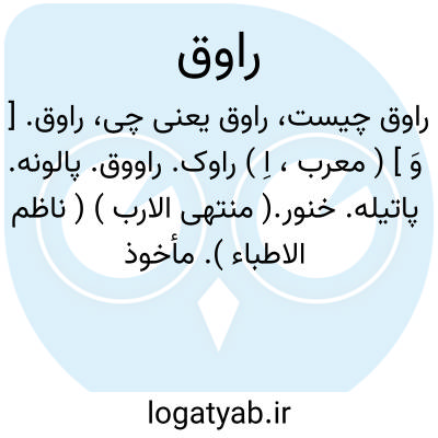 راوق. [ وَ ] ( معرب، اِ ) راوک. راووق. پالونه. پاتیله. خنور.( منتهی الارب ) ( ناظم الاطباء ). مأخوذ از پارسی «راوک ». ( ناظم الاطباء ) ( از آنندراج ) ( از غیاث اللغات ). پالونه شراب یعنی جامه و غیره که بآن شراب صاف کنند. ( از صراح اللغة ) ( از رشیدی ) ( غیاث اللغات ). پالونه. ( تفلیسی ) ( شرفنامه منیری ). این کلمه عربیست و تلفظ آن راووق با دو واوست و بمعنی صافی یعنی آنکه بوسیله آن مایعات را تمیز و صافی کنند. ( شرفنامه منیری ). آن است که زگال بید را در کیسه کرده و ظرفی در زیر آن گذارند و شراب در آن زگال ریزند که از زگال گذشته در آن ظرف ریزد و صافی شده در ظرف آید و رنگش در کمال سرخی و صفا شود. ( فرهنگ اوبهی ). ابن حاج نوشته که راووق بر وزن فاروق است بمعنی پالونه شراب نه راوَق، ولی حق این است که راوَق مخفف راووق است که واو ثانی را حذف کرده، واو اول را فتح داده اند زیرا که در کلام عرب، فاعل بضم عین نیامده است. ( از غیاث اللغات ) ( آنندراج ):