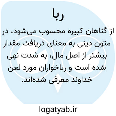 (یا: بهره) سودی که بدهکار افزون بر اصلِ بدهی به طلبکار می پردازد و به لحاظ شرعی حرام شمرده می شود. ربا به موجب مادۀ یک قانون نحوۀ اجرای اصل ۴۹ قانون اساسی بر دو نوع است: ۱. ربای قرضی، بهره ای است که طبق شرط یا بنا بر روال، قرض دهنده از قرض گیرنده دریافت می کند؛ ۲. ربای جنسی، زیاده ای است که یکی از طرفین معامله زائد بر عوض یا معوض از طرف دیگر دریافت می کند. قانون مجازات اسلامی در مادۀ ۵۹۵، رباخواری را جرم دانسته و برای ربادهنده، رباگیرنده و واسطۀ آن ها مجازات تعیین کرده است. طبق تبصرۀ این ماده، هرگاه ثابت شود ربادهنده در پرداخت وجه یا مالِ اضافی درمانده بوده از مجازات معاف است.