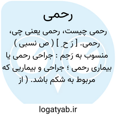 رحمی. [ رَ ح ِ ] ( ص نسبی ) منسوب به رَحِم: جراحی رحمی یا بیماری رحمی؛ جراحی و بیماریی که مربوط به شکم باشد. ( از یادداشت مؤلف ).