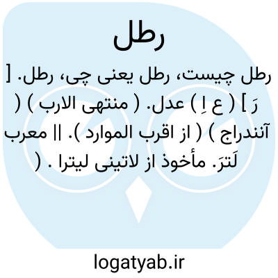 رطل. [ رَ ] ( ع اِ ) عدل. ( منتهی الارب ) ( آنندراج ) ( از اقرب الموارد ). || معرب لَترَ. مأخوذ از لاتینی لیترا. ( یادداشت مؤلف ). نیم من. ( بحر الجواهر ) ( السامی فی الاسامی ) ( از مهذب الاسماء ) ( دهار ).نیم من سنگ مکه و آن دوازده اوقیه است و اوقیه چهل درهم است. ( رساله اوزان و مقادیر مقریزی ). نصف من. ( مفاتیح العلوم ). دوازده اوقیه. ج، اَرطال. ( از اقرب الموارد ). نیم من و 12 اوقیه و اوقیه چهل درهم است.( منتهی الارب ) ( از آنندراج ) ( از غیاث اللغات ). به ترکی باتمان و در فارسی من گویند و در هر نقطه رطل وزن معینی دارد. رطل بر حسب تداول اشیاء 128 درهم است. ( از شعوری ج 2 ص 10 ). صد و بیست و هشت درهم در واسط و بصره. ( مفاتیح العلوم ). در منیه ابن خصیب صد و چهل و چهار درهم است. رطل در شهر اخمیم در نان و گوشت هزار درهم است و در دیگر حوایج دویست درهم. در شهر قوص برای نان و گوشت و سبزی سیصد و پانزده درهم است و در دیگر اشیاء دویست درهم است. در اسیوط در گوشت و نان هزار و ششصد درهم است و در دیگر حوایج دویست درهم. در منفلوط در نان و گوشت دویست درهم، و در دیگر چیزها صد و چهل درهم. رطل حجازی صد و بیست درهم است. رطل مصری صد و چهل و چهار درهم است. رطل بغدادی صد و سی درهم است. رطل دمشقی ششصد درهم است. رطل حموی ششصد و شصت درهم است. رطل حلبی هفتصد و بیست درهم است. رطل حمصی هفتصد و نود و چهار درهم است. رطل لیتی [و در نسخه لیثی ] دویست درهم است. رطل جروی سیصد و دوازده درهم است. رطل حرانی هفتصد و بیست درهم است. رطل عجلونی و رومی هزار و دویست درهم است. رطل غزاوی هفتصد و بیست درهم است. رطل قدسی و خلیلی و نابلسی هشتصد درهم است و رطل کرکی نهصد درهم است. ( از معالم القربة صص 80 - 81 ). وزنی معادل دوازده اوقیه که هر اوقیه 40 درهم باشد؛ یعنی رطل 480 درهم است و این رطل شامی است. در اهواز مساوی یکی از 112 هندروت است. ( یادداشت مؤلف ). واحدی است برای وزن و آن برابر دوازده اوقیه. مساوی 84 مثقال است. ( فرهنگ فارسی معین ).