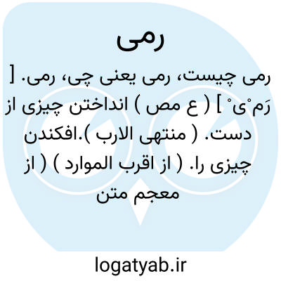 رمی. [ رَم ْی ْ ] ( ع مص ) انداختن چیزی از دست. ( منتهی الارب ).افکندن چیزی را. ( از اقرب الموارد ) ( از معجم متن اللغة ). رمایة. ( اقرب الموارد ). افکندن. پرتاب کردن.
