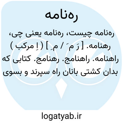 رهنامه. [ رَ م َ / م ِ ] ( اِ مرکب ) راهنامه. راهنامج. رهنامج. کتابی که بدان کشتی بانان راه سپرند و بسوی لنگرگاه و جز آن پی برند. معرب آن رهنامج و راهنامج است. ( یادداشت مؤلف ). کتاب شناساننده راهها: