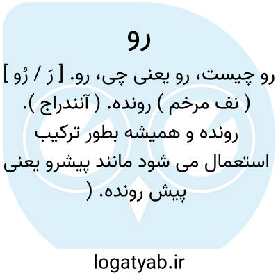 ( اسم ) ۱ - چهره رخ صورت وجه. ۲ - سطح رویه. ۳ - طرف بیرون چیزی مقابل پشت ظاهر. ۵ - اساس بنا شالده. ۶ - پر رویی وقاحت. یا از رو رفتن ( نرفتن ) ۱ - شرم کردن ( نکردن ) خجالت کشیدن ( نکشیدن ). ۲ - از میدان بدر رفتن ( نرفتن ): [[ اما خانم.... به این آسانیها از رو نمیرفت ]]. یا به رو در ماندن از شرم حضور کاری را پذیرفتن یا از چیزی صرف نظر کردن برودربایسی گیر کردن ماخوذ بحیا شدن. یا به روی خود نیاوردن اهمیت ندادن خود را آشنا به موضوع نشان ندادن. یا رو ترش کردن اخم کردن. یا رو در هم کشیدن اخم کردن. یا رو دست کسی زدن براوفایق آمدن.