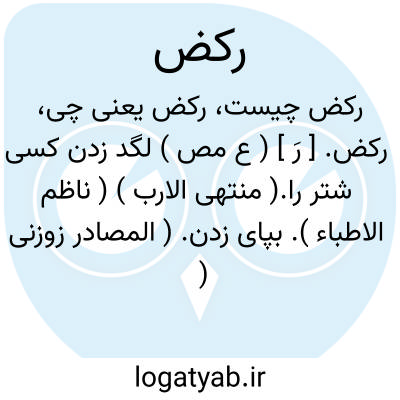 رکض. [ رَ ] ( ع مص ) لگد زدن کسی شتر را.( منتهی الارب ) ( ناظم الاطباء ). بپای زدن. ( المصادر زوزنی ) ( دهار ). || پای جنبانیدن و منه: ارکض برجلک؛ یعنی بجنبان. ( منتهی الارب ) ( از اقرب الموارد ). پای جنبانیدن اسب. ( آنندراج ). پای جنبانیدن. || اسب تاختن. ( غیاث اللغات ). راندن و اسب تاختن. ( منتهی الارب ) ( از اقرب الموارد ) ( ناظم الاطباء ). تاختن و دوانیدن ستور و برانگیختن اسب را و پای زدن برای تاختن. ( آنندراج ). دوانیدن ستور. ( المصادر زوزنی ) ( ترجمان جرجانی ) ( غیاث اللغات ). || تاخت بردن. تاختن: از بطش و انتقام و رکض و اقتحام هراسان بودند. ( جهانگشای جوینی ). به رکض مأسور قهر و مأمور فرمان می شود. ( جهانگشای جوینی ). || گریختن و منه: فاذا هم یرکضون منها. ( منتهی الارب ) ( ناظم الاطباء ). گریختن. ( از آنندراج ) ( از اقرب الموارد ). || دویدن: رکض الفرس مجهولاً فرکض هو؛ یعنی دوانیده شد پس دوید. ( منتهی الارب ) ( از اقرب الموارد ) ( ناظم الاطباء ). دویدن. ( المصادر زوزنی ). || بال جنبانیدن مرغ در هوا. ( منتهی الارب ) ( ناظم الاطباء ). بال جنبانیدن مرغ در پریدن. ( آنندراج ) ( از اقرب الموارد ). || ( اصطلاح عروض )نزد عروضیان نام بحری است از بحور شعر و آن از هشت بار فاعلن ترکیب می یابد و این بحر نوعی از متقارب است و آن را رکض الخیل نیز گویند [دویدن اسب ] و چون این بحر از مخترعات متأخران است بنام مُحدَث نیز نامیده می شود و متلاقی هم گفته اند همچنان که در جامع الصنایع بدین معنی اشاره نموده است. ( از کشاف اصطلاحات الفنون ). رجوع به محدث و متلاقی شود. توضیح. اولاً: چهار بار فاعلن از دایره متفقه است نه مختلفه. ثانیاً: نام آن بحر متدارک است نه رکض و محدث و متلاقی. ثالثاً: این بحر از موضوعات عروضی ابوالحسن اخفش است و جزءاصول اوزان عرب محسوب نمی شود و خلیل بن احمد نیز بعلت آغاز با سبب خفیف و در نتیجه سنگینی وزن با آن موافق نبوده است. رجوع به متدارک و المعجم ص 194 شود.