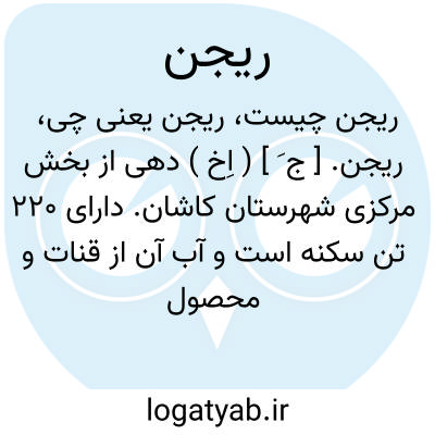 ریجن. [ ج َ ] ( اِخ ) دهی از بخش مرکزی شهرستان کاشان. دارای 220 تن سکنه است و آب آن از قنات و محصول عمده آنجا غلات و پنبه و تنباکو و صیفی و صنایع دستی زنان قالیبافی است. ( از فرهنگ جغرافیایی ایران ج 3 ).