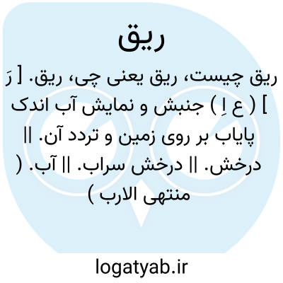 ریق. [ رَ ] ( ع اِ ) جنبش و نمایش آب اندک پایاب بر روی زمین و تردد آن. || درخش. || درخش سراب. || آب. ( منتهی الارب ) ( ناظم الاطباء ) ( آنندراج ). آب با لمعان آن. ( از اقرب الموارد ). || ( ص ) باطل. || خبز ریق؛ نان بی نان خورش. ( از اقرب الموارد ) ( منتهی الارب ) ( آنندراج ) ( ناظم الاطباء ).