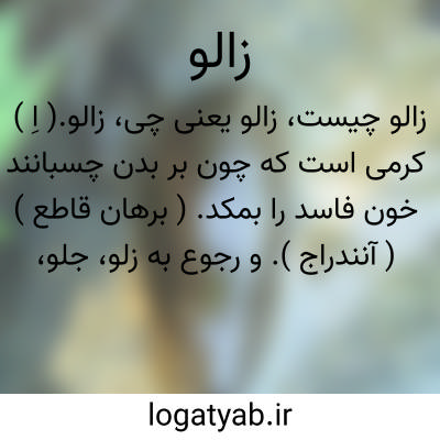 ( اسم ) جانوری است از شاخه کرمها جزو رده کرمهای حلقوی از دسته ئیرودینه ها که لوله گوارش اش در طول بدن حیوان به ۱۱ قسمت مشخص میشود زالو در قسمت سر و همچنین در انتهای بدن دارای بادکشهایی است که به وسیله آنها خود را بااشیائ یا حیوانات میچسباند زالو حیوانی است آبزی که در آب رودها جوی ها و برکه ها زندگی میکند دارای گونه های مختلفی است زالو در فسمت بادکش دهانی دارای سه ردیف آرواره بشکل میباشد که به رسیله آنها پوست بدن میزبان خودرا سوراخ کرده خون وی را می مکد زلو شلوک شلکا