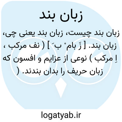 زبان بند. [ زَ بام ْ ب َ ] ( نف مرکب، اِ مرکب ) نوعی از عزایم و افسون که زبان حریف را بدان بندند. ( آنندراج ). تعویذی که برای زبان بندی دشمنان و بدگویان نویسند. ( غیاث اللغات ). افسون و عزائم. ( ناظم الاطباء ). نوعی از عزائم و افسون که زبان حریف را بدان خاموش توان کردن. ( از بهار عجم ): زبان بندهایی چو پیکان تیز دری در تواضع دری در ستیز.نظامی.بغمزه گفت با او نکته ای چند که بود از بوسه لبها را زبان بند.نظامی.نگیرد خردمند روشن ضمیر زبان بند دشمن ز هنگامه گیر.سعدی ( بوستان ).|| افسونگر. ( ناظم الاطباء ).