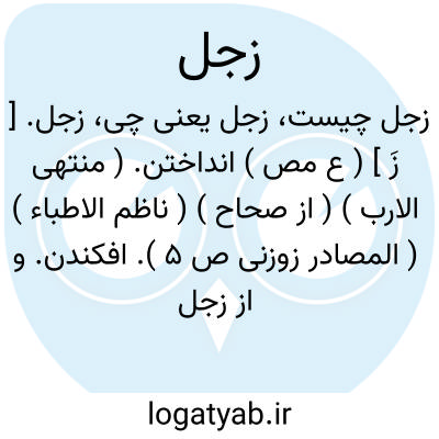 زجل. [ زَ ] ( ع مص ) انداختن. ( منتهی الارب ) ( از صحاح ) ( ناظم الاطباء ) ( المصادر زوزنی ص 5 ). افکندن. و از زجل بدین معنی است «لعن اﷲ امازجلت به »؛ یعنی لعنت خدای بر مادری که او را بیفکند. ( از منتهی الارب ) ( از اقرب الموارد ). افکندن و دور ساختن. ( از متن اللغة ). بینداختن. ( تاج المصادر بیهقی ). ماده زجل در اصل بمعنی رمی و دفع است. ( مقاییس اللغه ). افکندن و دور ساختن و بدین معنی در حدیث عبداﷲ سلام آمده: اخذ بیدی فزجل بی؛ یعنی دست مرا گرفت و مرا بدور انداخت. ( از تاج العروس ). || افکندن زن باردار بار خود را. زاییدن. گویند: لعن اﷲ امازجلت به؛ «لعنت بر مادری که او را بزاد».( از متن اللغة ). «زجلت الناقة بمافی بطنها»؛ یعنی افکند ناقه ( بچه ای که ) در شکم داشت یعنی آنرا بزاد. و نیز گویند: لعن اﷲ امازجلت به. ( از تاج العروس ). || ریختن آب منی در زهدان. ( از منتهی الارب ) ( از ناظم الاطباء ). ریختن نر آب خود را. ( از متن اللغة )( از محیط المحیط ) ( از تاج العروس ). || راندن. ( از منتهی الارب ) ( ناظم الاطباء ) ( از اقرب الموارد ). || آهن بن نیزه زدن کسی را. ( از منتهی الارب ) ( از اقرب الموارد ) ( از ناظم الاطباء ) ( از متن اللغة ) ( از اساس البلاغة ) ( از محیط المحیط ) ( از البستان ) ( از تاج العروس ). || برخی گفته اند زجل تیر انداختن است به کسی مرادف زج بهمین معنی. ( از تاج العروس ). تیرانداختن. ( از اساس البلاغة ). زجل را بمعنی تیرانداختن نیز آورده اند. ( از لسان العرب ) ( از تاج العروس ). و در حدیث است «انه اخذالحربة لابی بن خلف فزجله بها»؛ یعنی گرفت سلاح ابی خلف را و به او افکندو ابی را بدان زد و کشت. ( از لسان العرب ). || کسی را با تیر بدون سنان و بن زدن. ( از متن اللغة ). رجوع به تاج العروس شود. || رها کردن کبوتر را از دور. ( از متن اللغة ) ( از منتهی الارب ) ( از ناظم الاطباء ). و آن کبوتر را حمام الزاجل و حمام الزجال گویند، یعنی کبوتر دور پرواز. ( از اقرب الموارد ). فرستادن کبوتر قاصد. ( از تاج المصادر بیهقی ).