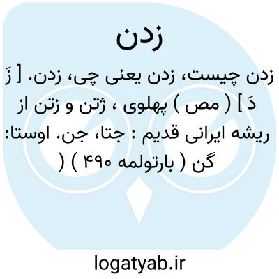 زدن. [ زَ دَ ] ( مص ) پهلوی، ژتن و زتن از ریشه ایرانی قدیم: جتا، جن. اوستا: گن ( بارتولمه 490 ) ( نیبرگ 258 ). پارسی باستان ریشه ٔ: اَجَنَم، جَن ( کشتن ). هندی باستان ریشه ٔ: هنتی هن و گم ( مضروب کردن، کشتن ). ارمنی: گن ( ضرب، تأدیب ) و گنم ( مضروب کردن، کتک زدن ). کردی: ژنین ( زدن آتش ) تیر انداختن. افغانی: واژنم. بلوچی: جنگ و جنغ، عاریتی و دخیل: زدگ و زذگا. شغنی: زینم. سریکلی: زنم. ویزینم ( فقه اللغه هرن 653 ). طبری: بزون ( زدن ) ( نصاب طبری 114 ). گیلکی: زن ( زدن )، بَزَنا ( بزند ). ( از حاشیه برهان قاطعچ معین ). فرود آوردن دست، تازیانه، شمشیر و مانند آن به تن کسی. کوفتن. ضرب و آسیب وارد آوردن. ( فرهنگ فارسی معین ). وارد آوردن صدمه و کوفتن و گویستن و برخورد کنانیدن چیزی را بسختی بر جایی و آسیب وارد آوردن. ( ناظم الاطباء ). جسمی را بجسم دیگر بزور رسانیدن.مثال: با دستم به سینه فلان زدم. از جمله مشتقات آن زد، میزند، زننده، زده، بزن. لفظ زدن در معانی مجازی بسیاری استعمال میشود. ( فرهنگ نظام ):