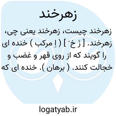 زهرخند. [ زَ خ َ ] ( اِ مرکب ) خنده ای را گویند که از روی قهر و غضب و خجالت کنند. ( برهان ). خنده ای که از اعراض و خشم کنند. ( فرهنگ رشیدی ). خنده ای از روی قهر و غضب و خشم و اغماض که از روی محبت و خوشی نباشد. ( از انجمن آرا ) ( آنندراج ). خنده ای که بحالت قهر و خجالت کنند. ( غیاث ). کنایه از خنده ای است که از روی غایت اعراض و خشم کنند. ( انجمن آرا ). خنده ای که از روی خشم کنند. ( فرهنگ فارسی معین ). خنده تلخ. ( ناظم الاطباء ). خنده از روی غضب. خنده ٔتلخ از غیظ و خشم. خنده ای از روی خشم یا دشمنی سخت.( یادداشت بخط مرحوم دهخدا ): هر کسی که رسید او را چنان خدمت کردند که پادشاهان را... و وی هرکسی را لطف میکرد و زهرخندی می زد. ( تاریخ بیهقی ).