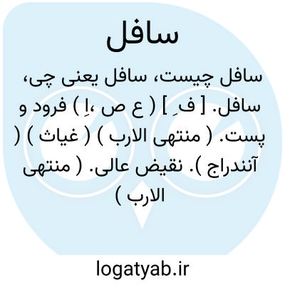 ( صفت ) ۱ - فرود پست پایین مقابل عالی بالا بلند. ۲ - مردم فرومایه دنی دون سفله جمع سفله و سفال و سافلین. یا انوار سافل ( سافله ) انوار متکائفه مقابل انوار عالیه. یا موجودات سافل ( سافله ) طبیعیات.