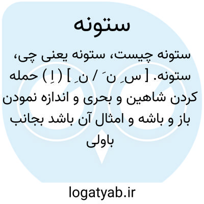 ستونه. [ س ِ ن َ / ن ِ ] ( اِ ) حمله کردن شاهین و بحری و اندازه نمودن باز و باشه و امثال آن باشد بجانب باولی، و باولی جانوری را گویند که بعضی از پر و بال او کنده باشند و در پیش باز و شاهین نو رسانیده و تازه به کار درآورده سر دهند تا به آسانی بگیرد. ( برهان ). حمله نمودن و اندازه کردن بحری و شاهین شکاری بجانب شکار خود. ( انجمن آرا ). || گریز و گریختن و بعربی فرار گویند. ( برهان ). گریز و فرار. ( انجمن آرا ) ( آنندراج ). || ستون ( پهلوی «ستونک » ). بمعنی تنه درخت است. رجوع کنید به ستون. ( حاشیه برهان قاطعچ معین ). موجه آب. ( برهان ) ( آنندراج ):