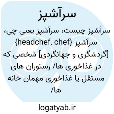 {headchef, chef} [گردشگری و جهانگردی] شخصی که در غذاخوری ها/ رستوران های مستقل یا غذاخوری مهمان خانه ها/ هتل ها مسئولیت تهیۀ انواع غذاها را بر عهده دارد
