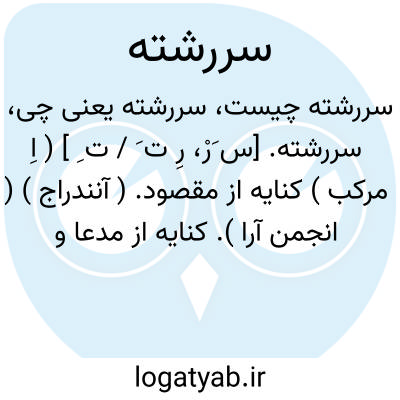 سررشته. [س َرْ، رِ ت َ / ت ِ ] ( اِ مرکب ) کنایه از مقصود. ( آنندراج ) ( انجمن آرا ). کنایه از مدعا و مقصود. ( برهان ). || چاره کار و تدبیر مطلب. ( رشیدی ). آگاهی. خبرت. بصیرت. علم. ( یادداشت مؤلف ):