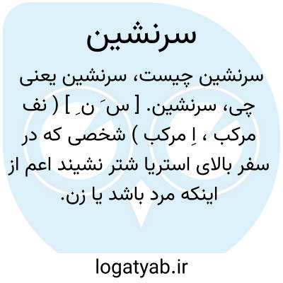 سرنشین. [ س َ ن ِ ] ( نف مرکب، اِ مرکب ) شخصی که در سفر بالای استریا شتر نشیند اعم از اینکه مرد باشد یا زن. ( آنندراج ). مسافری که بر بالای بار ستور یا ارابه نشیند. مسافری که بر ستوری اجیر یا کشتی یا راه آهن و اتومبیل کرایه و امثال آن باشد. ( یادداشت مؤلف ):