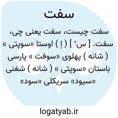 سفت. [ س ُ ] ( اِ ) اوستا «سوپتی » ( شانه ) پهلوی «سوفت » پارسی باستان «سوپتی » ( شانه ) شغنی «سیود» سریکلی «سود» سنگلیچی «سیود» آلبانی «سوپ ». و رجوع کنید به گریرسن 94. ( از حاشیه برهان قاطع چ معین ). کتف. ( برهان ) ( رشیدی ). کتف و دوش. ( غیاث ) ( جهانگیری ):