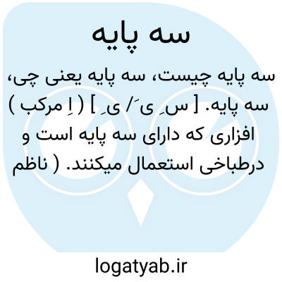 ( صفت ) ۱ - آن چه دارای سه عدد پایه باشد میز سه پایه. ۲ - آلتی فلزی مرکب از سه پایه متصل به دایره ای فوقانی که دیگ را بر آن گذارند و در زیر آن هیزم یا زغال افروزند دیگدان. ۳ - آلتی فلزی دارای سه عدد پایه که دوربین عکاسی را بر روی آن نصب کنند. ۴ - آلتی دارای دو پایه چوبی ثابت و یک پایه چوبی متحرک که تابلو نقاشی را روی آن گذاشته کار کنند. یا سه پایه تا شو. سه پایه ای است که برای مسافرت و استفاده از مناظر طبیعی و آسانی حمل و نقل از سه پایه تا شونده تشکیل شده.