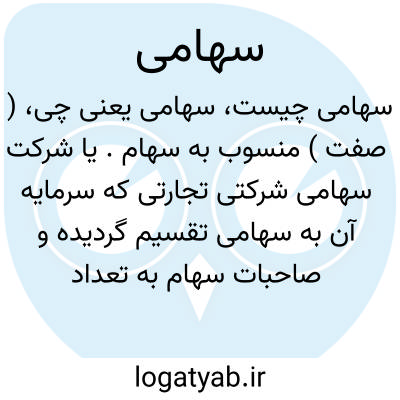 ( صفت ) منسوب به سهام. یا شرکت سهامی شرکتی تجارتی که سرمایه آن به سهامی تقسیم گردیده و صاحبات سهام به تعداد سهم خود حق رای دارند. سهام مذکور قابل انتقال است.