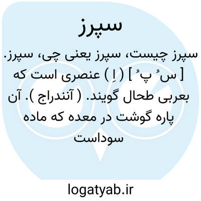 سپرز. [ س ُ پ ُ ] ( اِ ) عنصری است که بعربی طحال گویند. ( آنندراج ). آن پاره گوشت در معده که ماده سوداست بتازیش طحال نامند. ( شرفنامه ). اندامی است با منفعت بسیار و خانه سوداست و هرگاه سپرز فربه شود جگر و همه تن لاغر شوند ازبهر آنکه او ضد جگر است و فعل او آن است که سودا را که در وی خون است از خون جدا کند و بخویشتن کشد و مزه آن بگرداندو ترش کند و غذای خویش از آن بردارد و هر روز جزوی از آن سودا بمعده فرستد و ترشی آن معده را بگزد و شهوت طعام پدید آید. ( ذخیره خوارزمشاهی ):