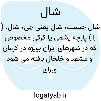 ( اسم ) ۱ - نوعی پارچه ساده یا گلدار که از پشم یا کرک بافند. یا شال کرمانی. شالی که در کرمان بافته شده. یا شال کشمیری. شالی که در کشمیر بافته شده. ۲ - بالا پوشی که از پارچه پشمی خشن سازند و کشاورزان پوشند. ۳ - پارچه ای دراز و کم عرض که دور کمر یا سر یا گردن پیچند. ۴ - گلیم کوچک پشمین.