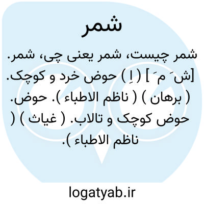 شمر. [ش َ م َ ] ( اِ ) حوض خرد و کوچک. ( برهان ) ( ناظم الاطباء ). حوض. حوض کوچک و تالاب. ( غیاث ) ( ناظم الاطباء ). آبگیر خرد. ( آنندراج ) ( انجمن آرا ). آبگیر. آبدان. ( فرهنگ اوبهی ). آبگیر. غفج. ( لغت فرس اسدی ). آبگیر خرد و شاید بمعنی آبگیر بزرگ هم اطلاق می شده. ( از فرهنگ لغات شاهنامه ). ژی. آبکند. ( یادداشت مؤلف ):