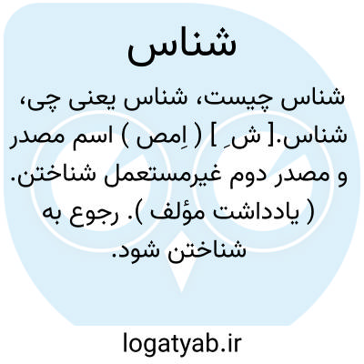 || ( ص ) آشنا: فلانی شناس است. ( فرهنگ فارسی معین ). آشنا. دوست ( در تداول عامه خراسان ). || ( اِ ) در کتب متقدمین پارسیان، شناس افاده معنی صفت معرفت می نماید، چنانکه صفات ثبوتیه را که عربی و مصطلح علما است پارسیان «شناسهای ایستا» ترجمه کرده اند، چه ایستا به معنی ایستاده و ثابت و غیرمتحرک است. ( انجمن آرا ) ( آنندراج ). || بیان و تفسیر و تعریف. ( ناظم الاطباء ).